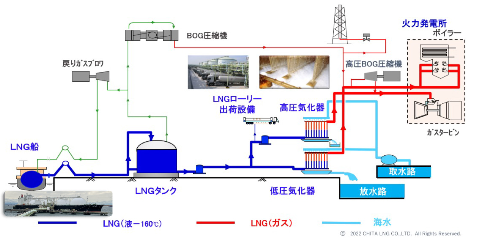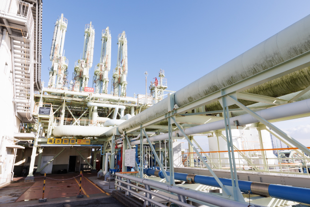 貯蔵されたLNGは、ポンプにより気化設備に送液し、海水で温め、再び気体の天然ガスに戻されます。気化工程では、適性な温度や圧力となるように安全かつ効率的にガス化することが求められます。気化された天然ガスは、供給先の要求に応じた成分調整や圧力調整が行われます。ガスの組成を分析し、規格に適合させたうえでパイプラインに送ります。