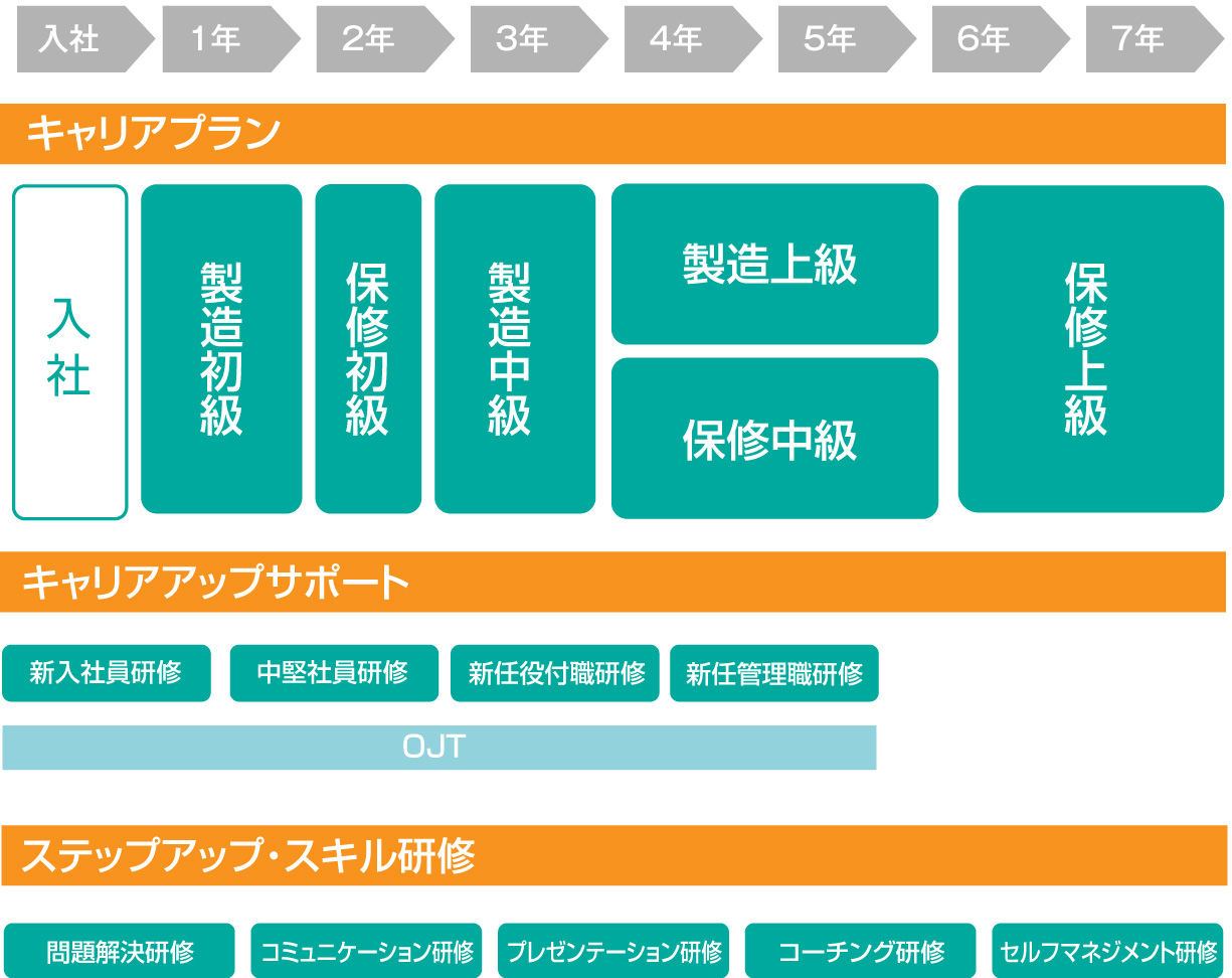 入社後は、基礎分野から専門分野に及ぶ研修、そしてOJT(オン ザ ジョブ トレーニング)で先輩社員が丁寧に指導しますから安心です。